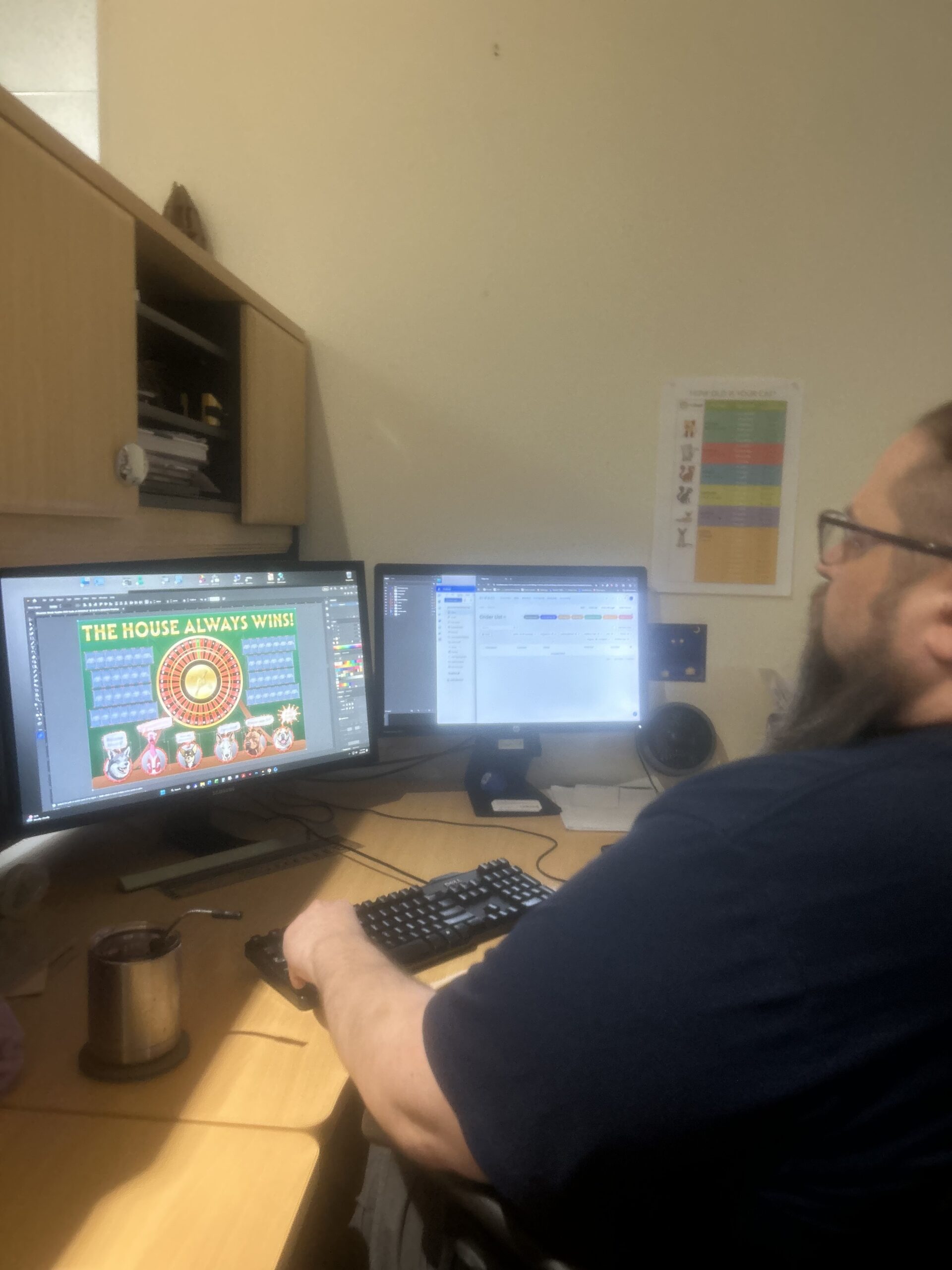 One project he always looks forward to is a yearly goals board created for a client called Mountain Movers Facades. Every year the concept gets more elaborate. This year’s design included an oversized roulette wheel, 52 playing cards, five dogs, and even a rubber chicken.