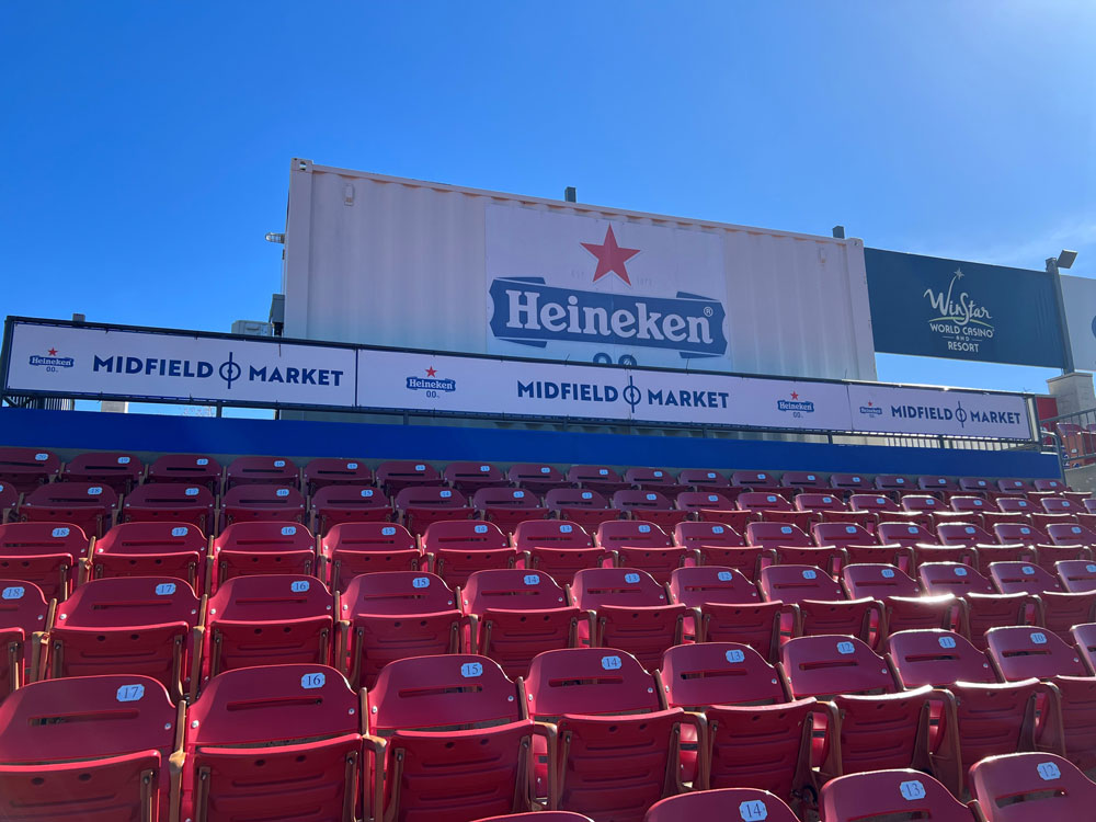 This bucket covers the pieces people notice first such as fence banners, sponsor panels, aluminum signs, and branded graphics around entry points, concourses, and fields. These are usually tied to visibility, durability, and making the environment feel coordinated.