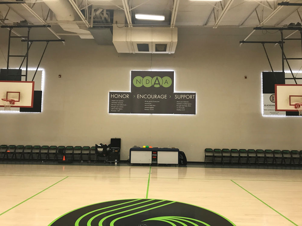 This project shows how school sports branding can extend beyond one sign and into windows, walls, and shared spaces. The value is not just the individual print piece. It is the consistency across the environment.